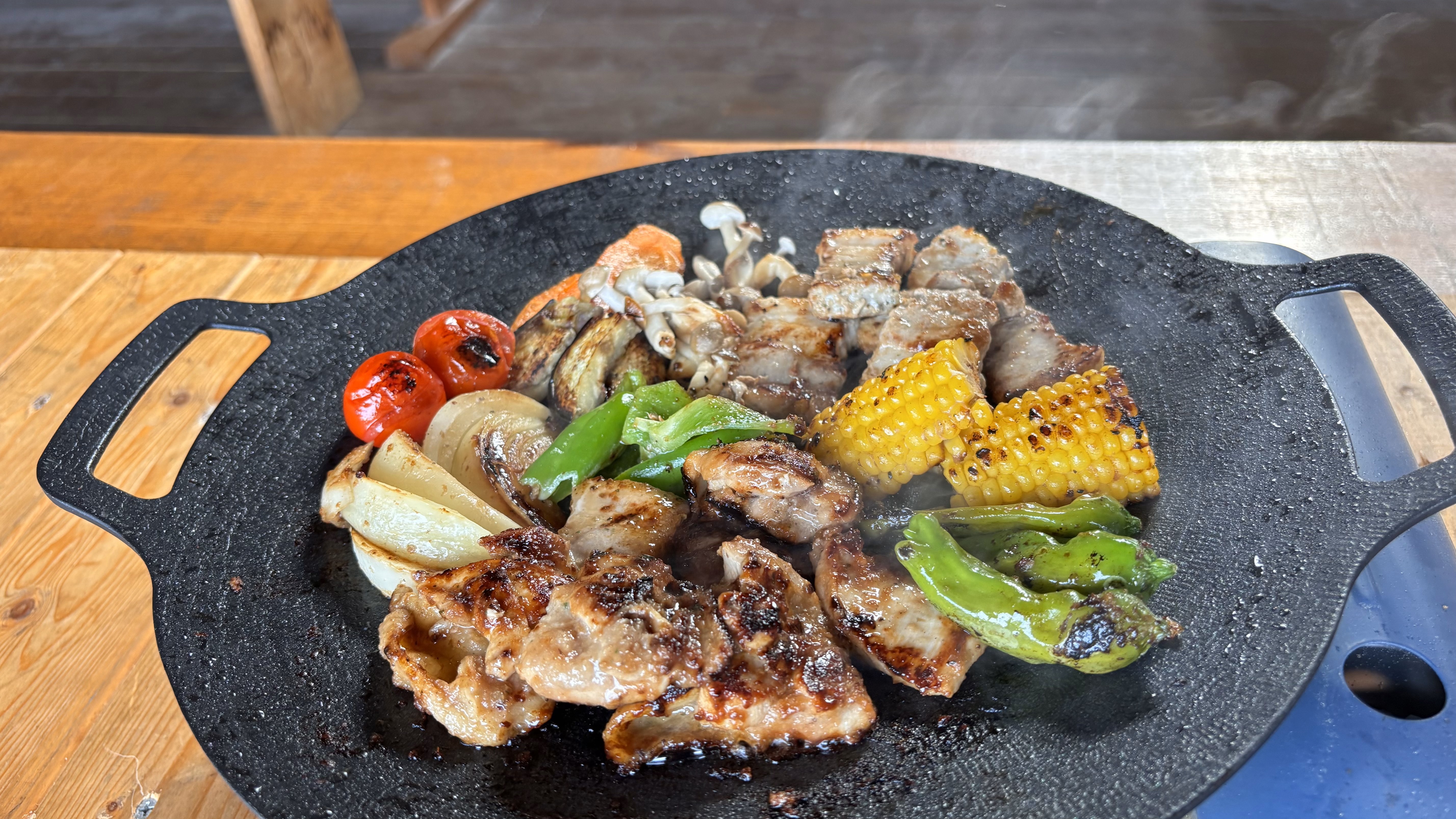 フルーツソース漬けの北海道産鶏のもも肉、香辛料を効かせた豚バラ肉と旬の季節野菜達。